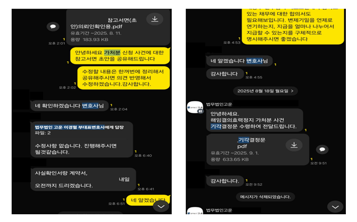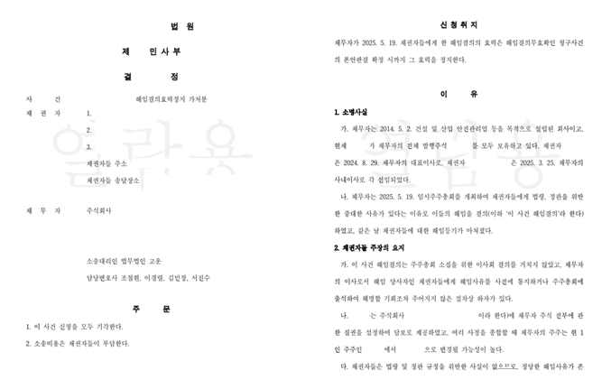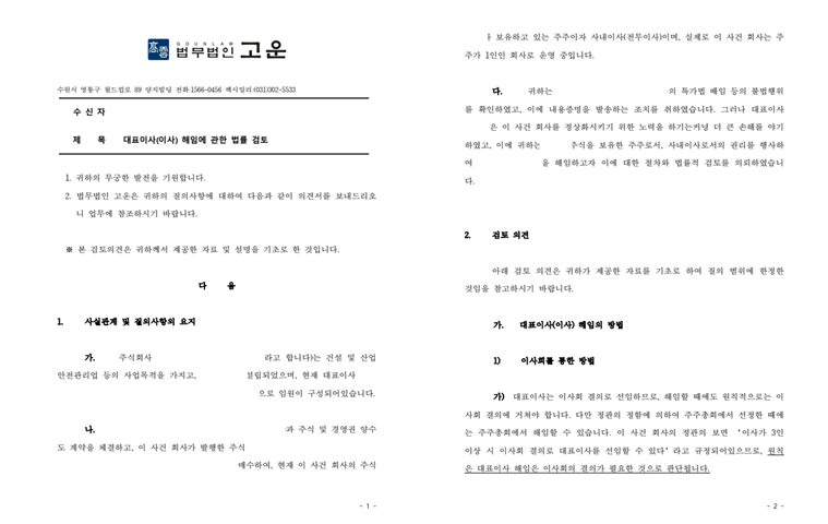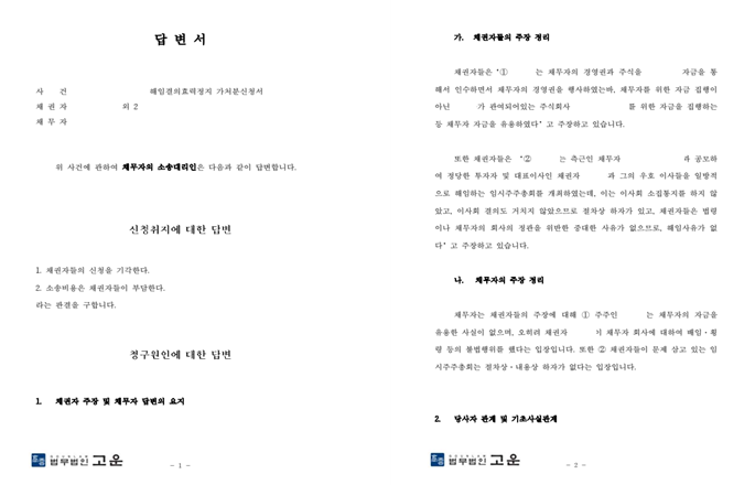 그러자 D측은 예상대로 S 주식회사를 상대로 해임결의효력을 다투는 가처분 소송을 진행하였고, S 주식회사는 위 소송에 대한 방어를 위해 또다시 법무법인 고운에 사건을 의뢰하였습니다.