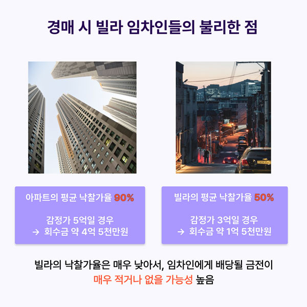 간단히 설명하면, 빌라는 낙찰가율이 낮기 때문에 경매를 하더라도 임차인에게 배당될 돈이 부족하기 때문입니다.