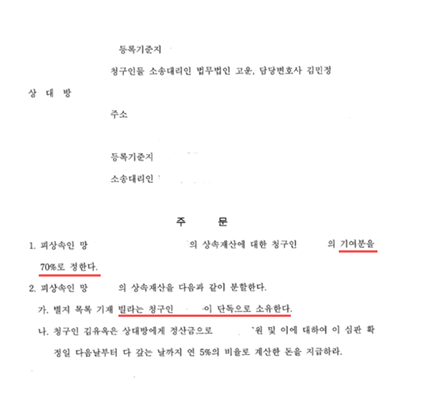 수원상속전문변호사가 상속재산분할심판 및 기여분 청구 사건에서, 피상속인을 특별히 부양한 청구인을 대리하여 청구인의 기여분을 70% 인정받고, 상속부동산을 단독소유하는 것으로 인정받은 사례