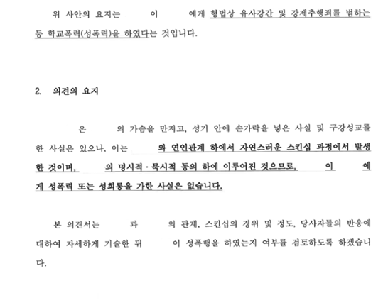 이후 법무법인 고운은 정리된 자료를 바탕으로 B 측이 성폭행 피해를 당하였다고 주장하는 날의 둘의 대화내용을 더욱 깊게 분석하여, B가 다소 강제적으로 성폭행을 당한 것처럼 말하는 부분이 있으나 전체적인 대화맥락을 살펴보면 A와 B의 성행위는 둘의 깊은 애정 하에 합의 하에 이루어진 것이며 오히려 B가 성행위를 원했던 사정 등을 구체적으로 의견서에 기재하였습니다.