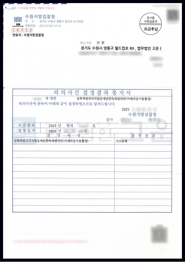 검찰은 법무법인 고운이 제출한 자료와 논리를 종합적으로 검토한 결과, 의뢰인이 정신질환으로 인해 인지능력이 일시적으로 저하된 상태에서 범행이 이루어진 점, 성적 목적이 명확히 입증되지 않은 점, 초범이며 깊이 반성하고 피해자들과 원만히 합의한 점 등을 고려하여, 기소유예 처분으로 사건을 종결하였습니다.