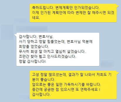 이 사건의 경우 의뢰인이 사기 범죄의 피해자라는 점에서 특히 좋은 결과가 나오기를 바라며 열심히 사건을 진행하였습니다. 그 덕분인지 법원 또한 채무자의 어렵고 딱한 사정을 모두 고려하여 상당히 낮은 변제율에도 불구하고 변제계획안을 인가하여 주었습니다.