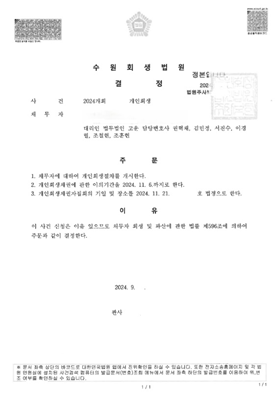 이러한 법무법인 고운의 적극적인 입증을 통하여 본 사건은 무난하게 개시결정 및 변제계획인가까지 받을 수 있었습니다.