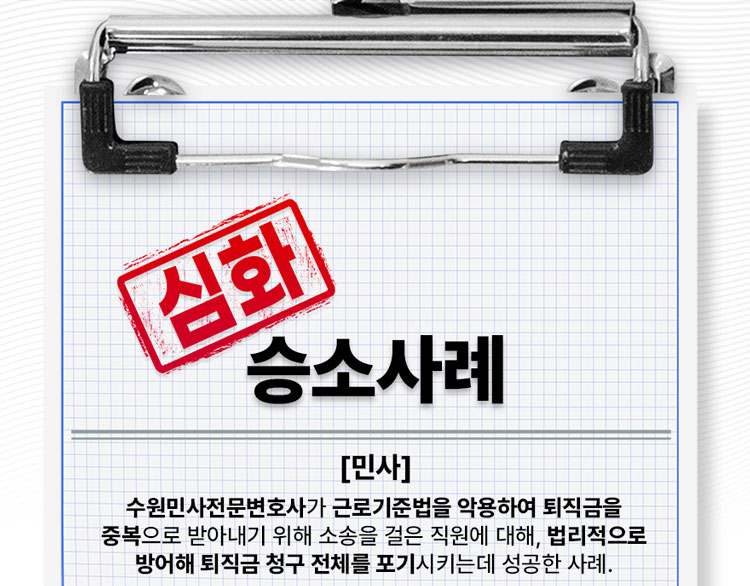 수원민사전문변호사가 근로기준법을 악용하여 퇴직금을 중복으로 받아내기 위해 소송을 걸은 직원에 대해, 법리적으로 방어해 퇴직금 청구 전체를 포기시키는데 성공한 사례.