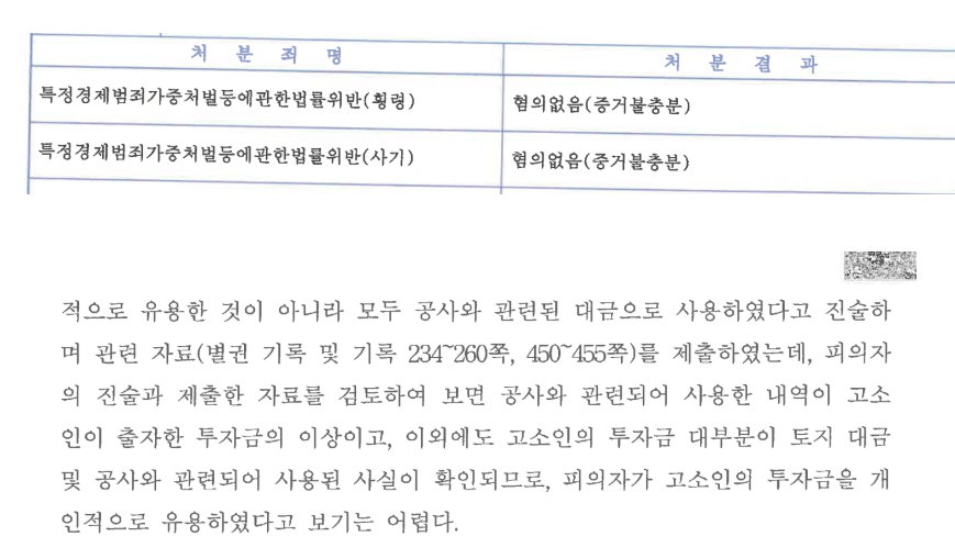 수사기관은 투자를 받은 지인이 사업자금을 사용한 내역을 받아 의뢰인의 5억원이 모두 건물 신축사업에 소요된 사실까지는 확인해었습니다. 그러나 투자금이 건축사업에 소요된 내역이 있어 범죄라 단정하기는 어렵다며 증거불충분으로 무혐의 처분을 하였습니다.