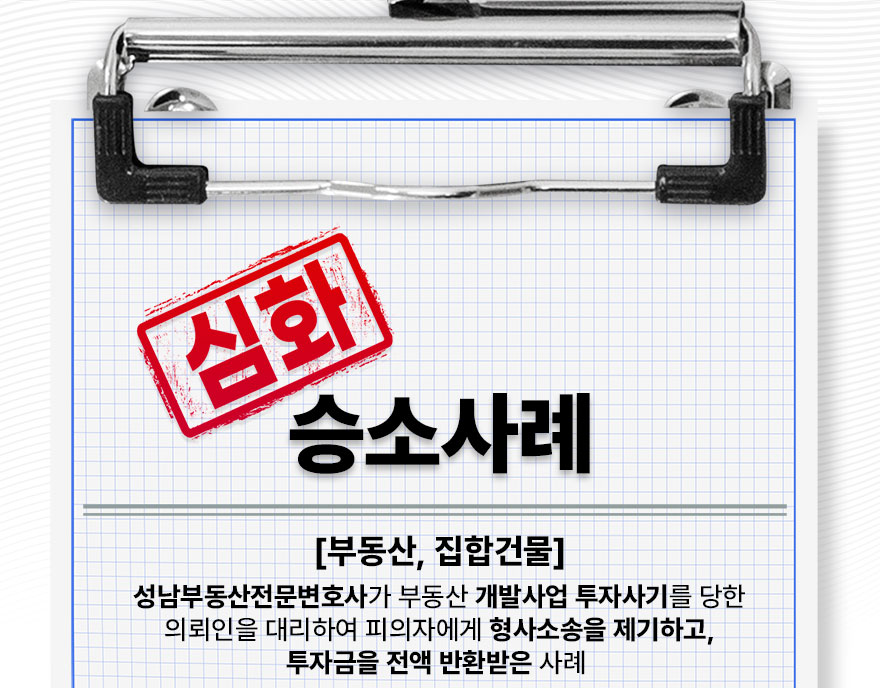 성남부동산전문변호사가 부동산 개발사업 투자사기를 당한 의뢰인을 대리하여 피의자에게 형사소송을 제기하고, 투자금을 전액 반환받은 사례