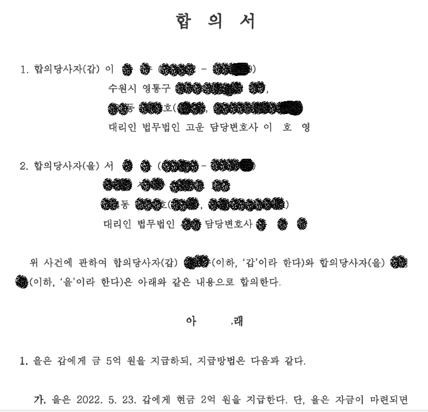 오랜 공방 끝에 결국 의뢰인은 원금 5억원 전액을 받으며 피의자와 합의하였습니다.