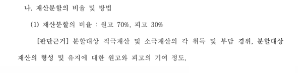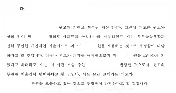 이에 또한 법무법인 고운은 의뢰인의 기여도가 높다는 점을 주장하기 위해서도 여러 주장을 하였습니다. 보유하고 있던 재산의 형성 경위와 의뢰인의 실질적인 기여 정도, 이혼 경위, 그 외 기여도에 고려할만한 사정들을 주장하여 의뢰인의 기여도가 월등히 높다는 점에 대하여 적극적으로 주장하였습니다.