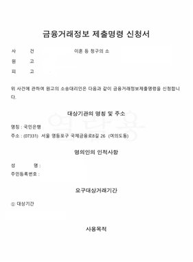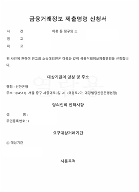 의뢰인이 이혼 소송을 제기하자 피고 측에서는 곧바로 의뢰인에 대하여 재산분할을 청구하였고, 이에 따라 재산분할을 위한 절차들이 진행되었습니다. 법무법인 고운은, 재산명시명령에 따라 각자가 제출한 재산목록을 확인한 후 의뢰인과 피고의 별거기간 중 피고가 은닉하거나 소비한 재산이 없는지 확인하기 위하여 금융거래정보제출명령 신청 등 여러 증거신청을 하였습니다.