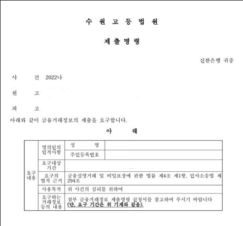 하지만 통상 유류분 소송에서 법원은 피상속인 명의 계좌의 거래내역이 아닌 상속인 명의 계좌의 거래내역을 확인하는 것은 과도한 사생활 침해라고 보아 증거신청을 하여도 불채택하는 경우가 많고, 더욱이 1심에서 확인하지 않은 내역을 항소심에서 확인하고자 하는 것은 더욱 허가해주지 않는 경향이 있습니다. 이 사건 담당재판부 역시 상대방들 명의 계좌의 거래내역을 확인하는 것에는 매우 부정적인 입장을 보였습니다. 또한 상대방들은 상대방 명의 재산 형성 경위에 관한 법무법인 고운의 지적에 대하여 파편적인 거래내역을 제출하며 피상속인과 무관하게 재산을 형성한 것이라고 반박하면서, 상대방들 거래내역에 대한 제출명령은 불필요하다고 강하게 주장하였습니다.