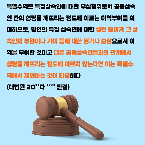 유류분 소송의 경우 상속인이 재산을 증여받았는지 여부 및 증여받은 재산의 가액, 증여받은 재산이라고 하더라도 특별수익으로 볼 수 있는지 여부가 가장 분쟁의 핵심이 되고, 특히 증여받은 재산이라고 하더라도 예외적인 경우에 해당하여 특별수익에서 제외하는 것이 상당히 까다롭습니다.