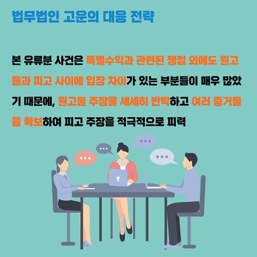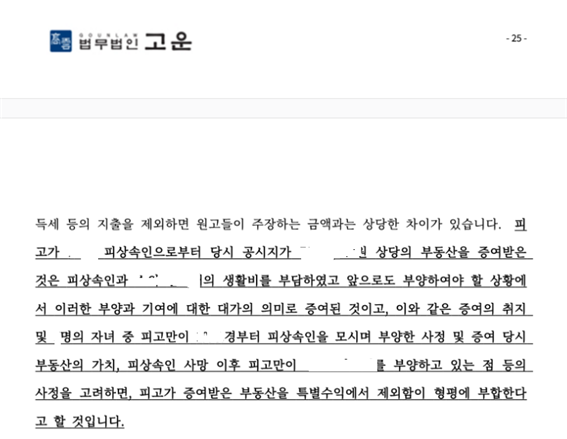 이 때문에 법무법인 고운은 의뢰인이 장기간 부모님을 특별히 부양한 사실을 최대한 입증하여, 의뢰인이 피상속인으로부터 부동산을 증여받은 것이 공동상속인간의 실질적 형평을 깨뜨리지 않는다는 점을 인정받기 위하여 최선을 다하였고, 여러 가지 방향으로 다양한 변론을 거쳤습니다.