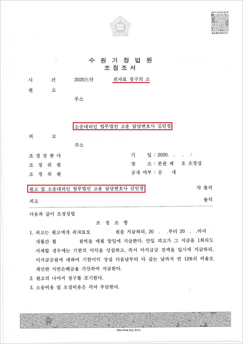 법무법인 고운은 우선 상간자 C씨가 B씨에게 배우자가 있다는 사실을 알고도 B씨와의 부정행위를 한 점, 배우자인 A씨의 요구에도 불구하고 B씨와의 관계를 정리하지 않고 지속한 점 등에 대하여 주장 입증하였습니다. 또한, 이들의 부정행위로 인하여 혼인관계가 파탄된 점 등 다른 사례보다 더 높은 위자료가 인정되어야 할 사정에 대하여 적극 주장하였습니다. 결국 조정절차를 통하여 의뢰인 A씨가 C씨로부터 청구금액 대부분을 지급받는 것으로 원만히 조정하였습니다.