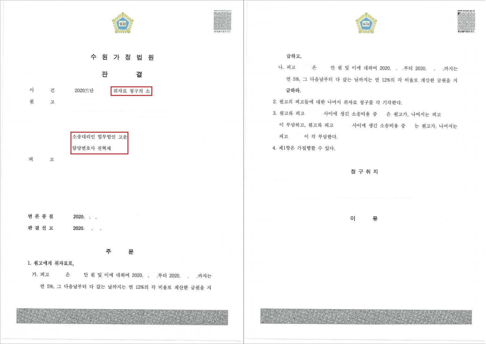 저희 법무법인 고운은 상간자들이 B씨에게 배우자가 있음을 알면서도 상당기간 알고 지내며 부정행위를 하였다는 점을 적극 주장 입증하였습니다. 또한 이들의 부정행위로 인하여 긴 세월 지속해 온 혼인관계가 파탄에 이르게 된 점 등 특히 다른 사례보다 더 높은 위자료가 인정되어야 할 사정에 대하여 적극 주장하였습니다. 그 결과, 청구금액 대부분을 인정받는 판결이 선고되었습니다.