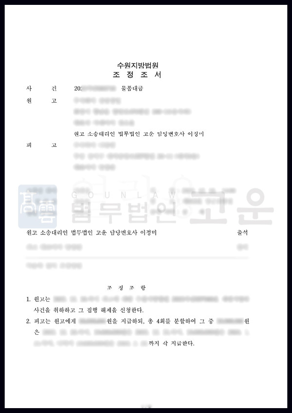 그 결과 재판부는 법무법인 고운의 주장을 모두 인정하였고, B로 하여금 A에게 밀린 대금을 지급하는 것은 물론, 그에 대한 지연이자도 모두 지급하라는 판결을 내렸습니다. 법무법인 고운의 적절한 조력으로 대금을 모두 받는 것은 물론 지연이자를 받게 되어 그 동안 입은 손해를 조금이나마 보상받을 수 있었고, 의뢰인 A 역시 해당 결과에 대해 매우 만족하였습니다.