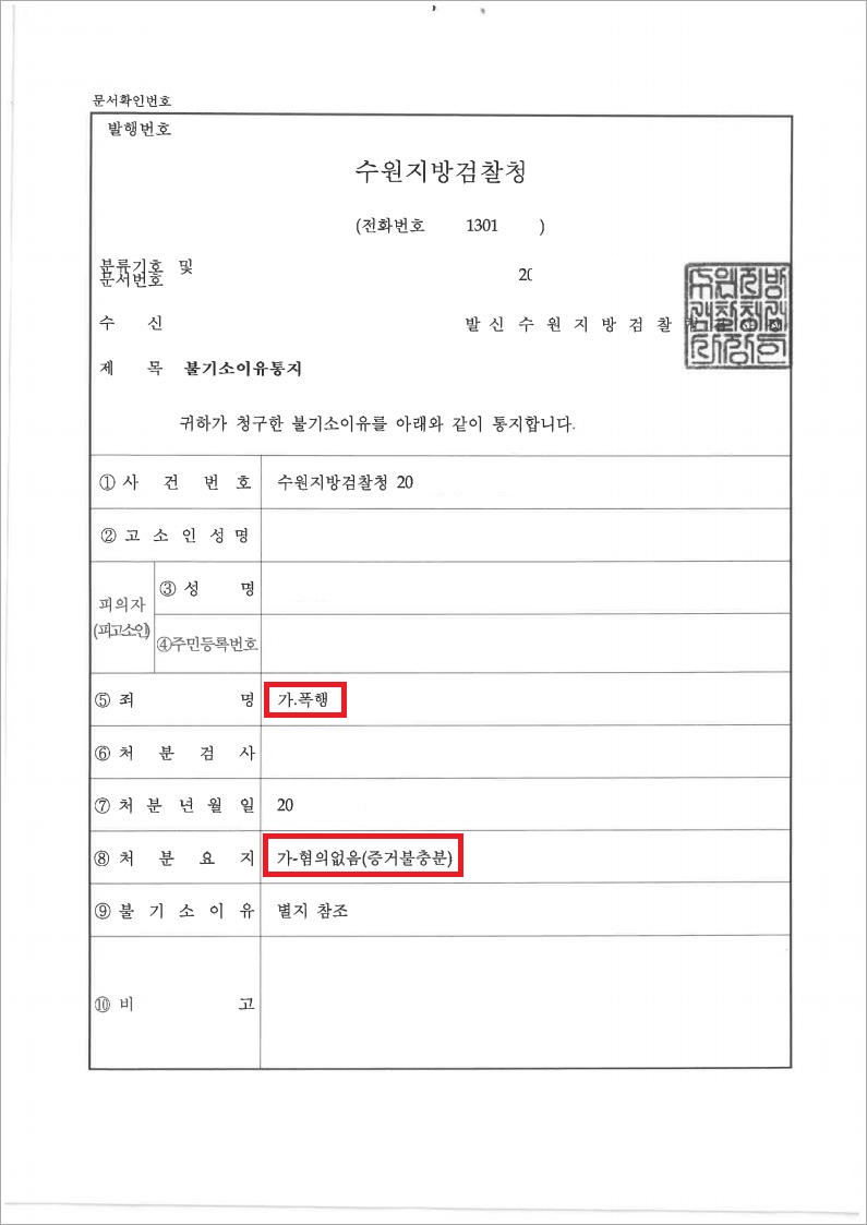 검찰은 법무법인 고운의 주장을 받아들여 의뢰인에게 혐의 없음 처분을 내렸습니다. 의뢰인은 억울하게 폭행 전과자가 될 뻔한 상황에서 무죄 판단을 받았다는 사실에 매우 만족하였습니다.