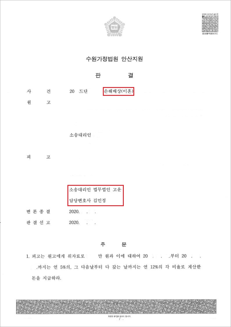 본 사건의 경우 부정행위 기간이 길었던 점 및 B씨의 배우자를 상대로 한 관련 사건에서 부정행위로 인한 위자료 책임이 인정된 점 등 불리한 사정이 있었으나, 다만 B씨가 주장하는 내용 중 사실이 아닌 부분이 있는 점 등 위자료 액수에 참작할 사정이 상당히 있었습니다. 이에 저희 법무법인 고운은 위와 같은 부분과 B씨의 혼인관계가 부정행위 이전부터 상당히 파탄나 있었던 점 등 위자료 감액에 참작할 만한 여러 사정에 대하여 적극 변론하였고, 그 결과 법원은 B씨가 청구한 금액에서 50% 이상 감액된 손해배상금을 지급하라는 판결을 하였습니다.