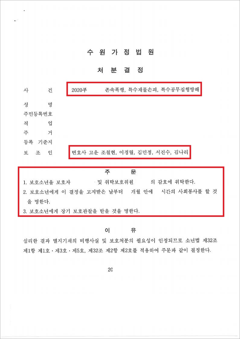 재판부는 의뢰인이 잘못을 모두 인정하고 반성하고 있다는 사실과 법무법인 고운의 주장을 상당 부분 받아들여 소년분류심사원 위탁 처분결정 없이 1호, 3호, 5호에 해당하는 보호처분을 내렸고, A는 집으로 돌아갈 수 있었습니다.