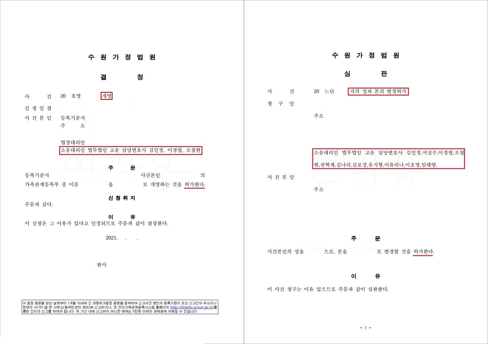 법무법인 고운은 사건본인 C씨가 계부 및 동생과 성이 다른 상황에서 겪을 수 있는 괴리감과 학교 생활을 함에 있어 놀림을 받게 되면 재혼가정에서 자라는 사건본인에게 큰 상처가 될 수 있는 점 등 C씨의 성을 계부의 성과 본으로 변경되어야 하는 필요성에 대하여 적극 소명하였습니다.