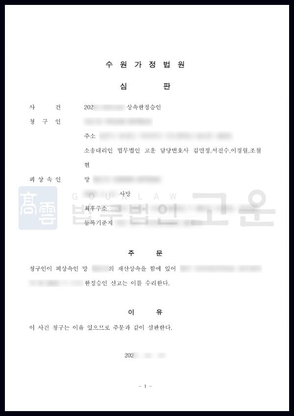 그 결과 재판부는 고운의 한정승인심판 청구를 인용 하였습니다. 해외에서 살다 갑자기 모친이 진 채무를 모두 변제해야 할 위기에 처했던 의뢰인이었지만, 고운의 신속한 대처와 사건 진행으로 인해 해외에서 무리 없이 한정승인을 진행하고, 무사히 채무 변제의 위기에서 벗어날 수 있어 의미가 있는 사건이었습니다.