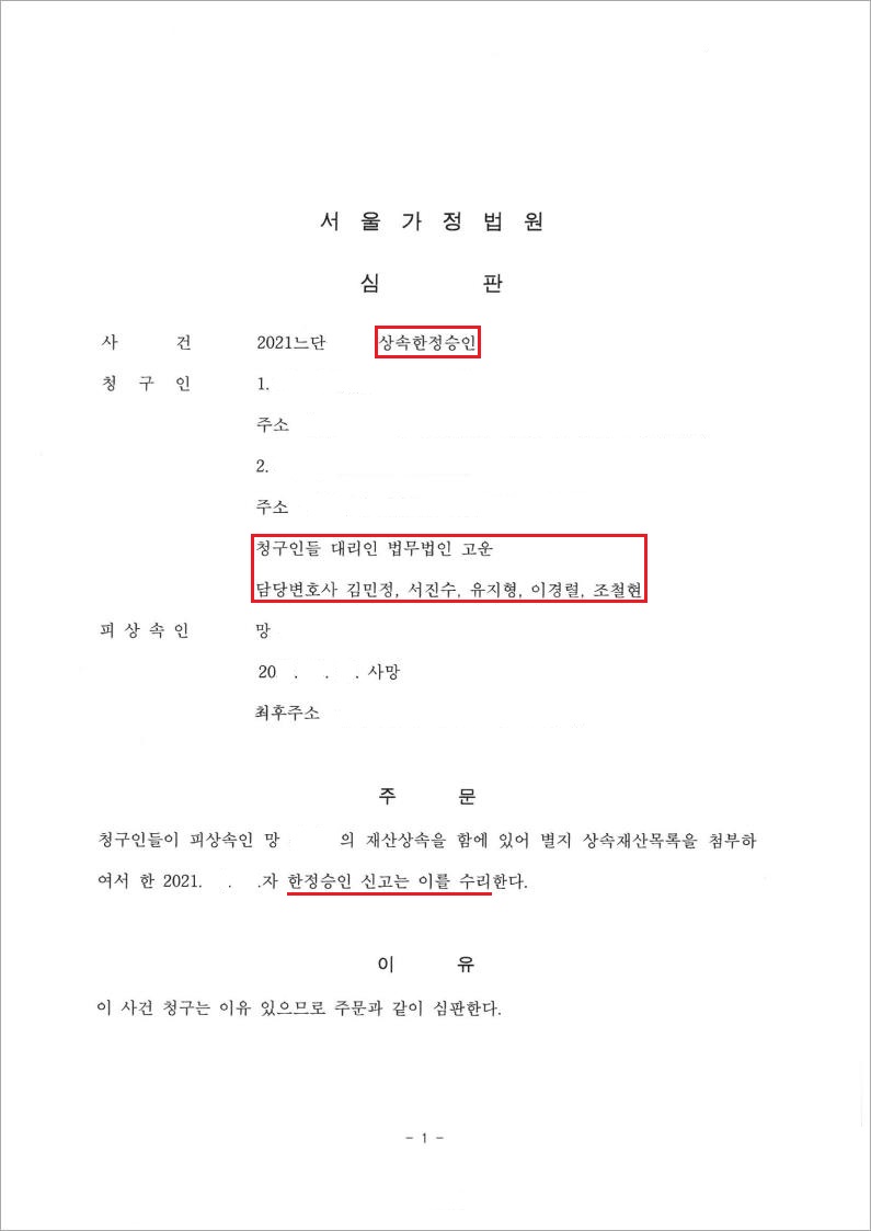그 결과, 법원으로부터 한정승인 인용 심판을 받게 되었고 신문공고 등 후속절차까지 조속히 마무리하였습니다.