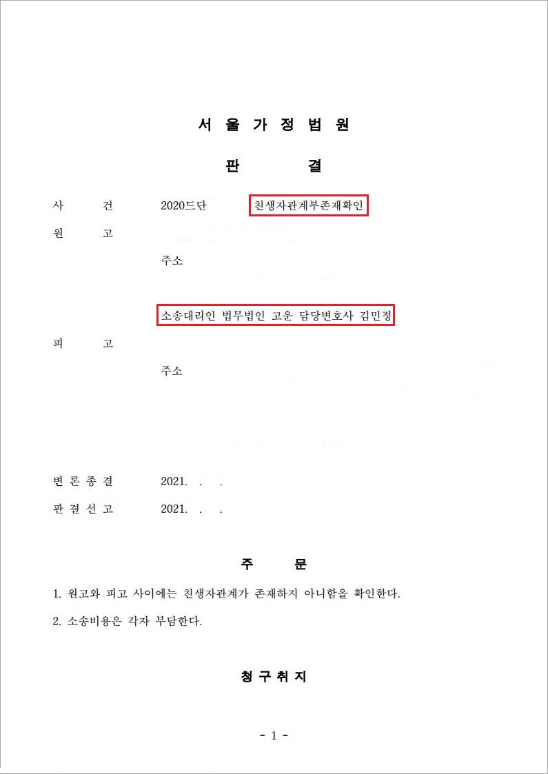 통상 친생자관계부존재 확인소송에서는 유전자검사가 필요하나, 현재 사정상 A씨와 D씨 사이에 유전자검사를 진행할 수 없는 상황이었고, 이에 저희 법무법인 고운은 유전자검사 외에 간접적인 증거들을 통하여 A씨와 D씨 사이에 친모자 관계가 존재하지 않는다는 점에 대하여 적극 입증하였습니다.