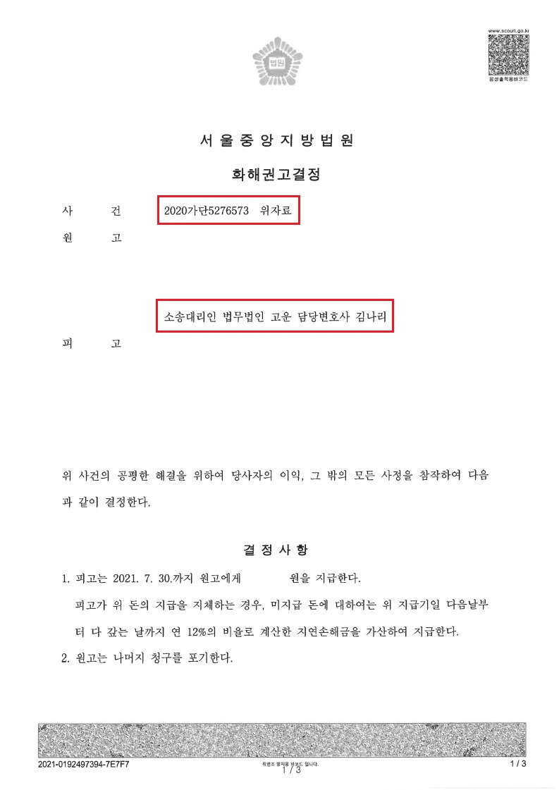 법원 재판부는 법무법인 고운의 주장을 대부분 받아들였고, 의뢰인 A씨가 상대방 B씨의 부정행위로 인하여 상당한 정신적 고통을 받았다는 사실을 인정하고, B씨는 A씨에게 금원을 지급하라는 화해권고결정을 하였습니다. 이후 당사자들 간 이의제기 없이 사건 확정되었고, 이에 의뢰인 A씨는 소송 결과에 매우 만족하셨습니다.