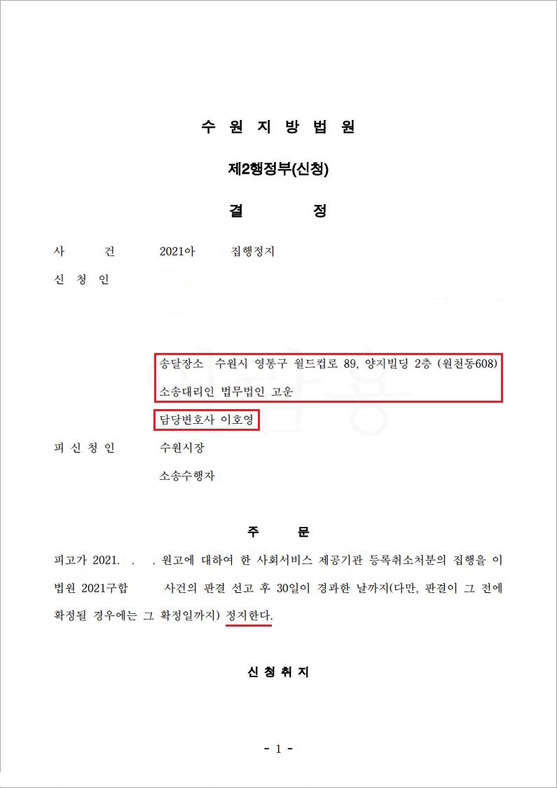 법무법인 고운은 우선 사회서비스 제공기관 등록취소처분에 대하여 이의제기를 하였고, 위 소송이 진행될 동안 처분에 대한 집행이 정지될 수 있도록 집행정지신청을 하였습니다.