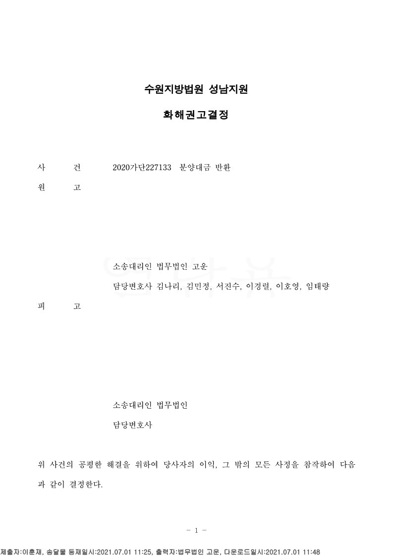 법원 재판부는 법무법인 고운의 주장을 받아들였고, 당사자 간 분양계약을 보면 상대방 주식회사 B의 입주 지연, 수익금 지급 지체, 수익금 지급 거절로 인하여 의뢰인 A에게 계약해제권이 발생 된다고 판단하였으며, 계약 해제로 인하여 손해배상 청구권 또한 발생 된다고 판단하여, 의뢰인 A씨의 분양대금반환 청구 등을 인정하였습니다. 이에 의뢰인 A씨는 소송 결과에 매우 만족하셨습니다.
