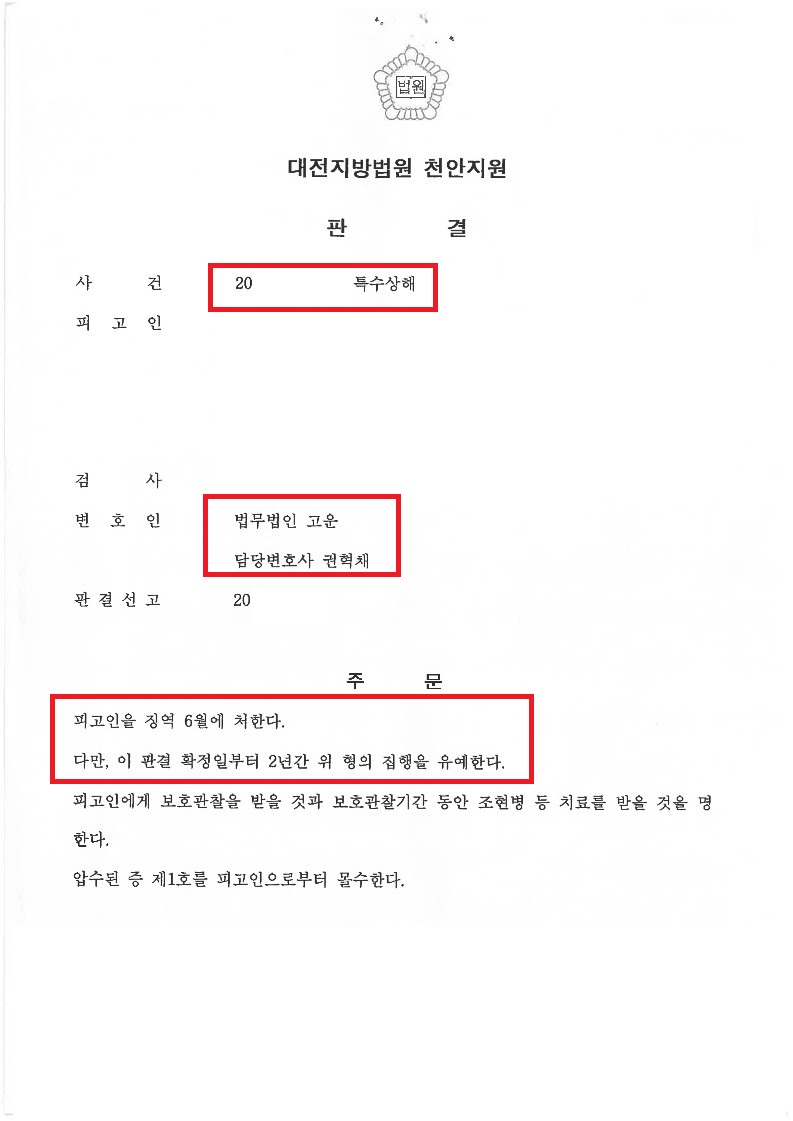 재판부는 법무법인 고운의 주장을 받아들여 피고인에게 집행유예를 선고하였습니다. 실형을 피해 다시 가족의 곁으로 돌아갈 수 있게 되었다는 사실에 의뢰인과 가족들은 만족했습니다.