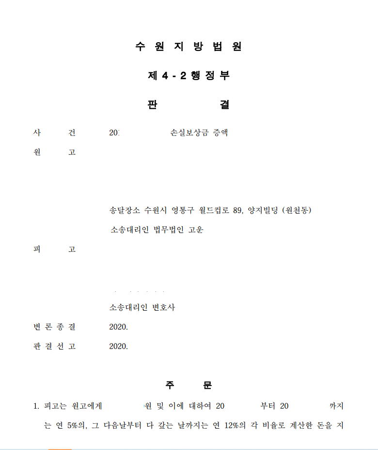 법원은 결국 고운의 주장을 받아들여 보상금액을 추가로 인정하였습니다. 의뢰인 A씨는 소송결과에 매우 만족해하였습니다.