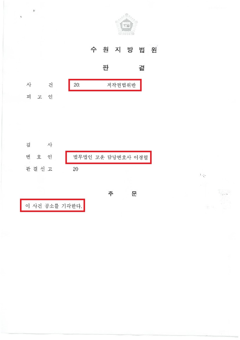법무법인 고운은 의뢰인이 자신의 피의사실을 인정하고 수사에 협조적이며 반성하고 있는 점을 강조했습니다. 그리고 특별히 자신의 경제적 이익을 위해 저작권을 침해한 것이 아닌 점, 전과 사실이 전혀 없는 점, 피해자에게 진심어린 사과를 한 끝에 합의에 성공한 점 등 의뢰인에게 유리하게 작용할 부분들을 적극 주장하였습니다.