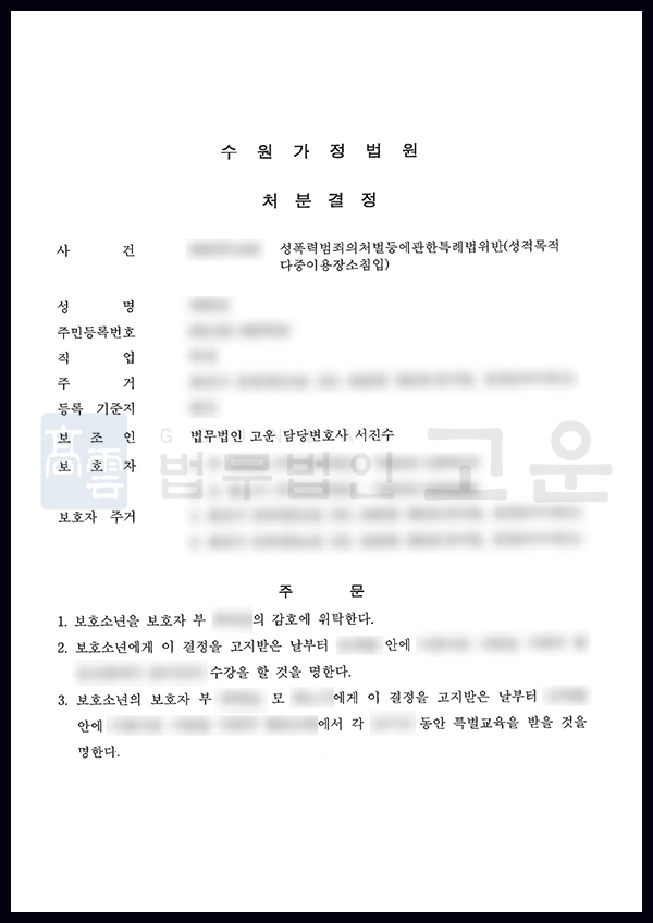 가. 성적 목적으로 공중장소에 침입한 경우, 어린 나이라 할지라도 중한 처분을 받을 수 있고, 또한 소년분류심사원으로 보내져 수감생활을 해야 하는 경우가 많기 때문에 초반부터 적극적인 변론을 통해 최대한 낮은 처분을 받을 수 있도록 하는 것이 중요한 상황이었습니다.
