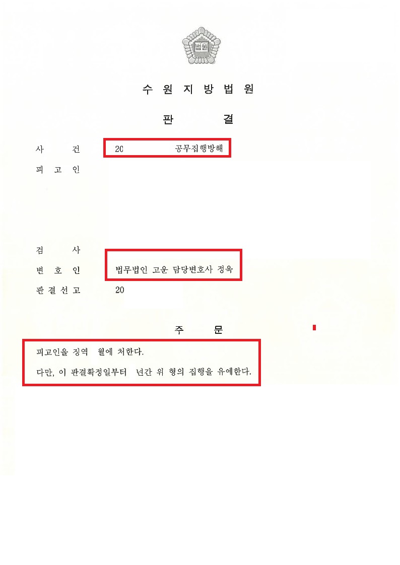 법무법인 고운은 의뢰인이 술에 취해 기억을 못 하고 있지만, 자신이 경찰관을 폭행했다는 사실을 진심으로 반성하고 있다는 점을 주장했습니다. 그리고 의뢰인이 절대 의도적으로 공무를 방해한 것은 아닌 점, 폭행의 정도가 심해지 않은 점, 평소 의뢰인이 심하게 스트레스를 받고 있던 점 등 의뢰인에게 유리한 점들을 법원에 적극 주장하였습니다.