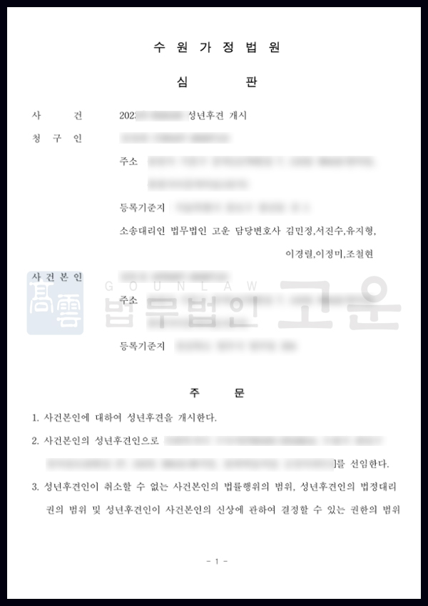 법원이 문제삼았던 여러 부분에 대해 빠르고 충분하게 소명을 하였고 덕분에 비교적 빠르게 성년후견 개시 심판을 받게 되었으며 그 과정에서 A씨는 B씨의 성년후견인으로 선임되었습니다. 신속하고 원만하게 이루어진 결과 덕분에 A씨는 금전적 어려움 없이 좀 더 여유있게 B씨를 돌볼 수 있게 되었습니다.