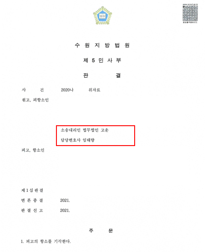 결국 재판부는 법무법인 고운의 주장을 받아들여 2심에서도 C의 부정행위에 의한 위자료를 인정하였고, C의 항소를 기각한다는 판결을 선고하였습니다. 이에 의뢰인은 소송 결과에 매우 만족하였습니다.