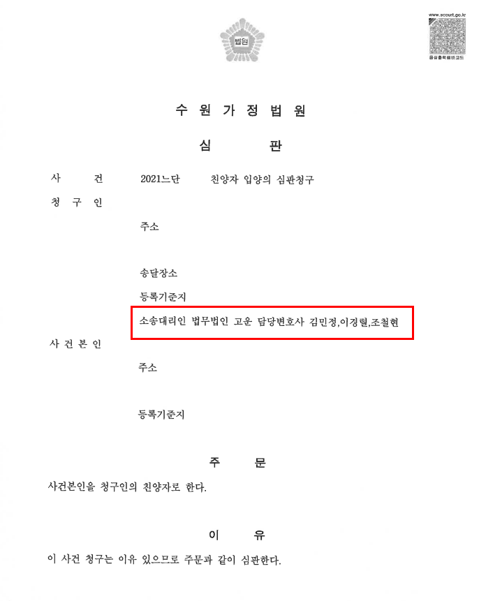 이에 저희 법무법인 고운은 자녀의 양육환경 등에 비추어 자녀의 복리를 위하여 친양자 입양이 꼭 필요한 사유에 대하여 적극 주장하며 가사조사를 진행하게 되었고, 결국 친생부모 측의 명시적인 반대에도 불구하고 친양자 입양 심판을 받게 되었습니다.