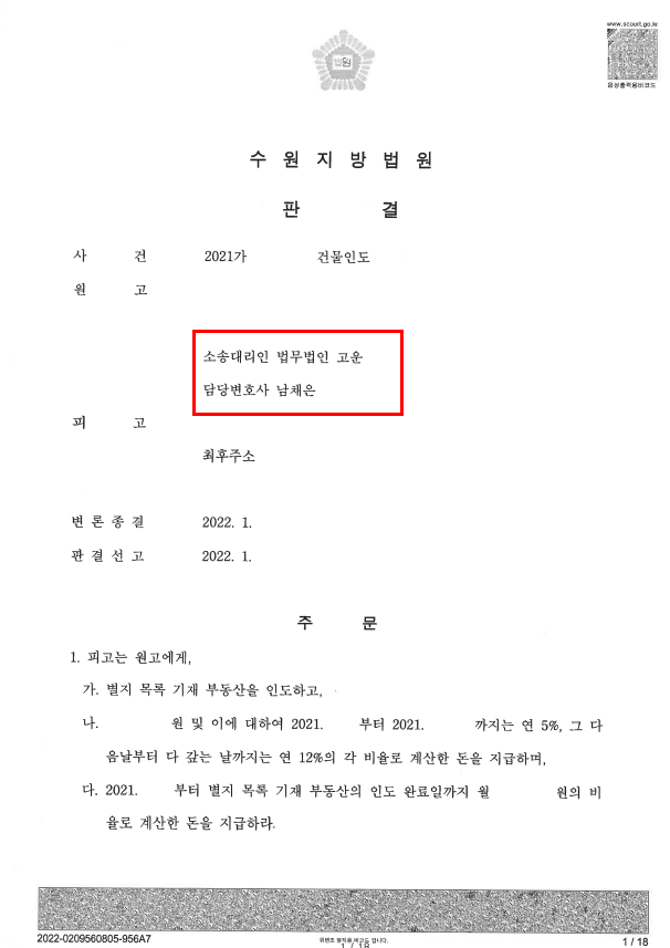 결국 재판부는 법무법인 고운 측의 주장을 전부 받아들여 건물인도와 차임 등을 지급하라는 전부승소 판결이 선고되었고, A씨는 B씨에 대한 강제집행을 할 수 있게 되어 매우 만족하였습니다.