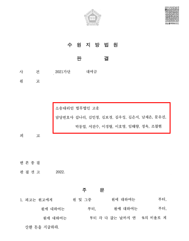 재판부는 상대방의 주장을 배척하고 법무법인 고운의 의견을 모두 받아들여, 결국 대여금 원금과 약정된 이자를 모두 인정받아 승소판결을 이끌어냈습니다. 이에 의뢰인은 매우 만족하였습니다.