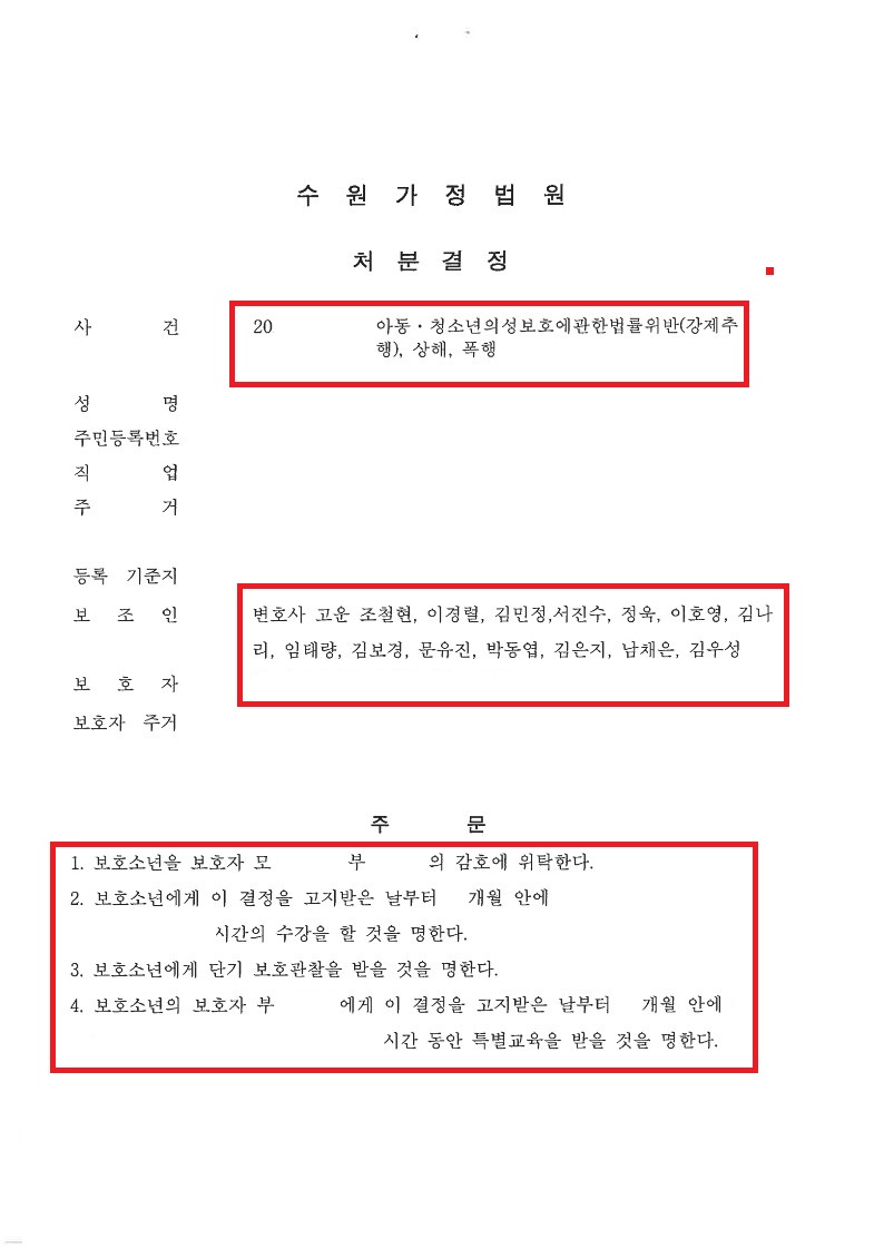 재판부는 보호소년과 부모님이 재발 방지를 위해 많은 노력을 하고 있다는 점을 감안하고, 법무법인 고운의 주장을 받아들여 합의가 안되었음에도 수위가 낮은 1호와 2호, 4호 보호처분을 내렸습니다. 낮은 처분으로 끝났다는 사실에 의뢰인과 부모님들은 마음을 놓을 수 있었습니다.