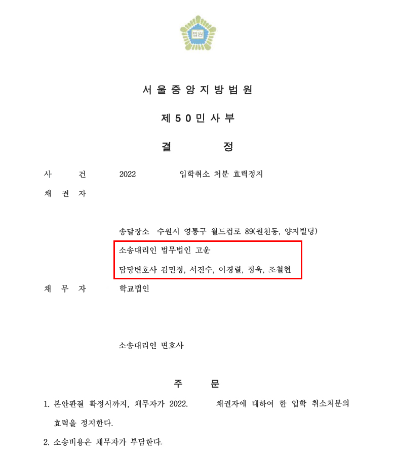 결국 법원은 본안에서 판단을 받아볼 필요성이 있다고 보아, A씨의 입학취소 처분 효력정지 가처분을 인용하였습니다.