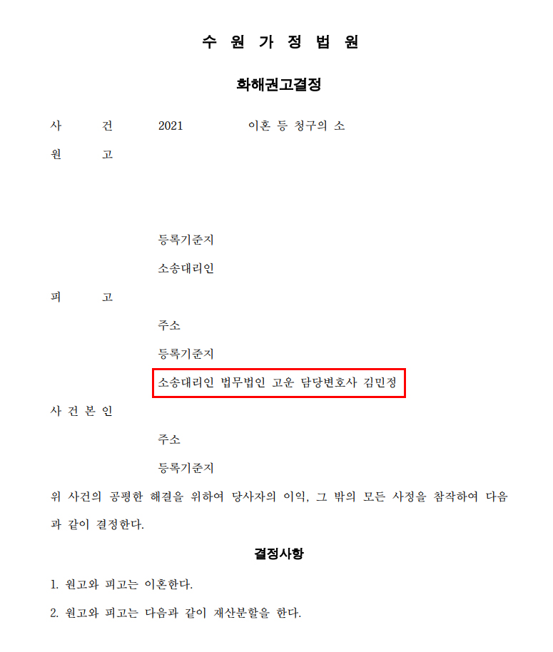 결국 의뢰인 A씨가 바라던 내용으로 원만히 재산분할 및 양육비에 관하여 합의가 이루어졌고, 그 외에도 향후 자녀들에 대한 교육비 등에 관한 부분도 만족할만한 협의가 이루어져 합의한 내용으로 화해권고결정을 받게 되었습니다.
