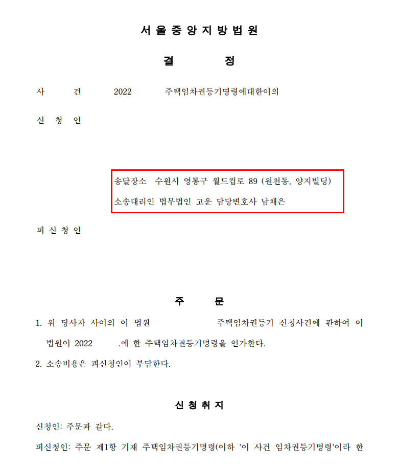법원은 법무법인 고운의 신청을 받아들여 주택임차권등기명령 신청을 인용하였습니다.