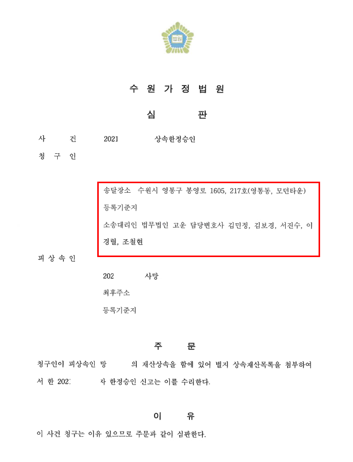 A씨가 아버지 B씨로부터 받은 상속재산 범위 내에서 채무를 변제할 수 있도록 신속히 한정승인 심판청구를 진행하고, 한정승인 인용 심판을 받은 뒤 신문공고 등 후속절차까지 신속히 마무리 하여, A는 부친이 남긴 많은 상속채무의 책임에서 벗어날 수 있게 되었습니다.