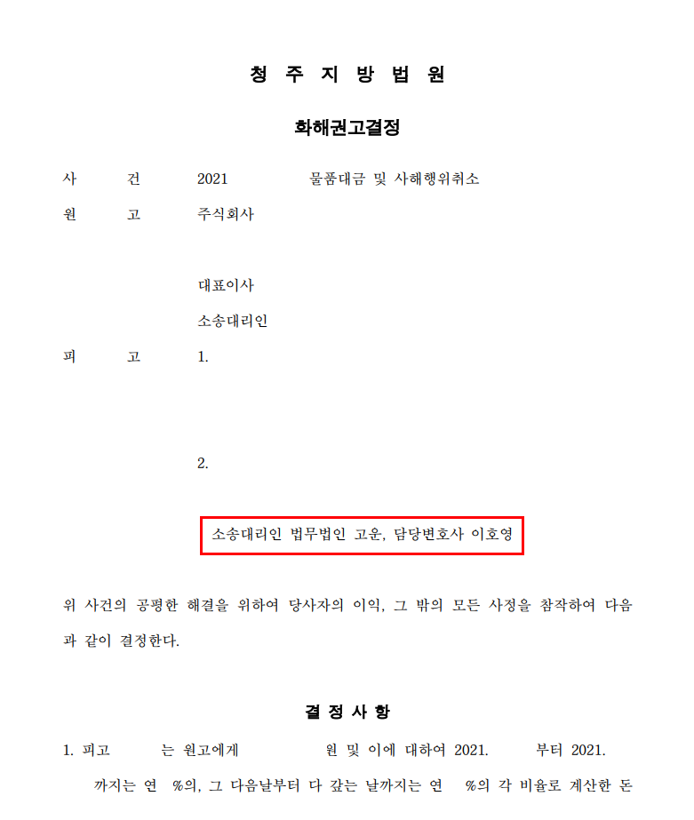 재판부는 A씨가 C회사에게 일정 금원을 지급하되, A씨가 그대로 부동산을 보유할 수 있도록 C회사가 한 부동산의 가압류 집행을 취하하라는 화해권고 결정을 내렸습니다. 의뢰인 A씨는 이 결정에 매우 만족하였습니다.