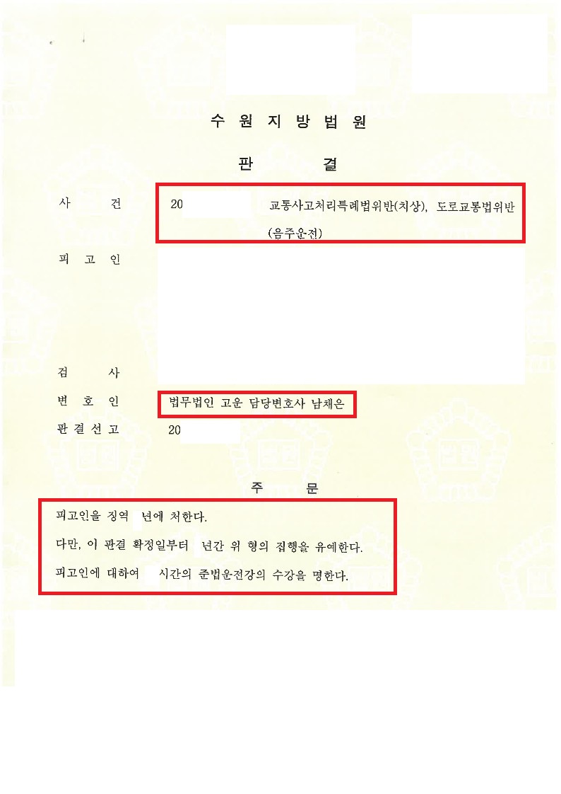 재판부는 법무법인 고운의 주장을 상당 부분 받아들여 집행유예 판결을 내렸습니다. 음주운전 다수 적발임에도 불구하고 적극적인 변론을 통해 집행유예로 끝났다는 사실에 의뢰인은 매우 만족하였습니다.