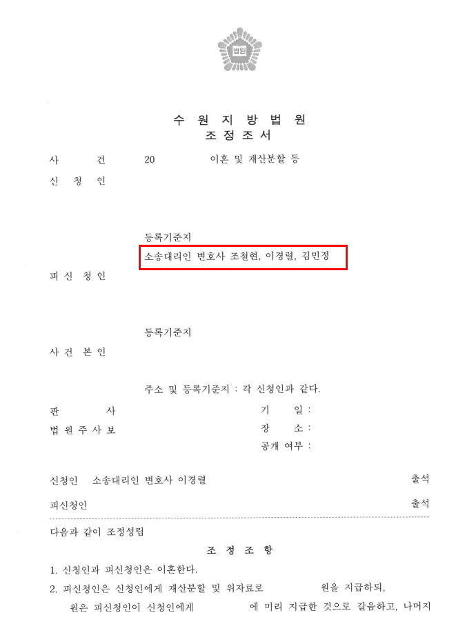 법무법인 고운은 조정절차를 진행하며 의뢰인에게 양육권을 지정해줄 것과 재산형성 기여도에 따른 재산분할에 대해 상대방에게 제시하였습니다.