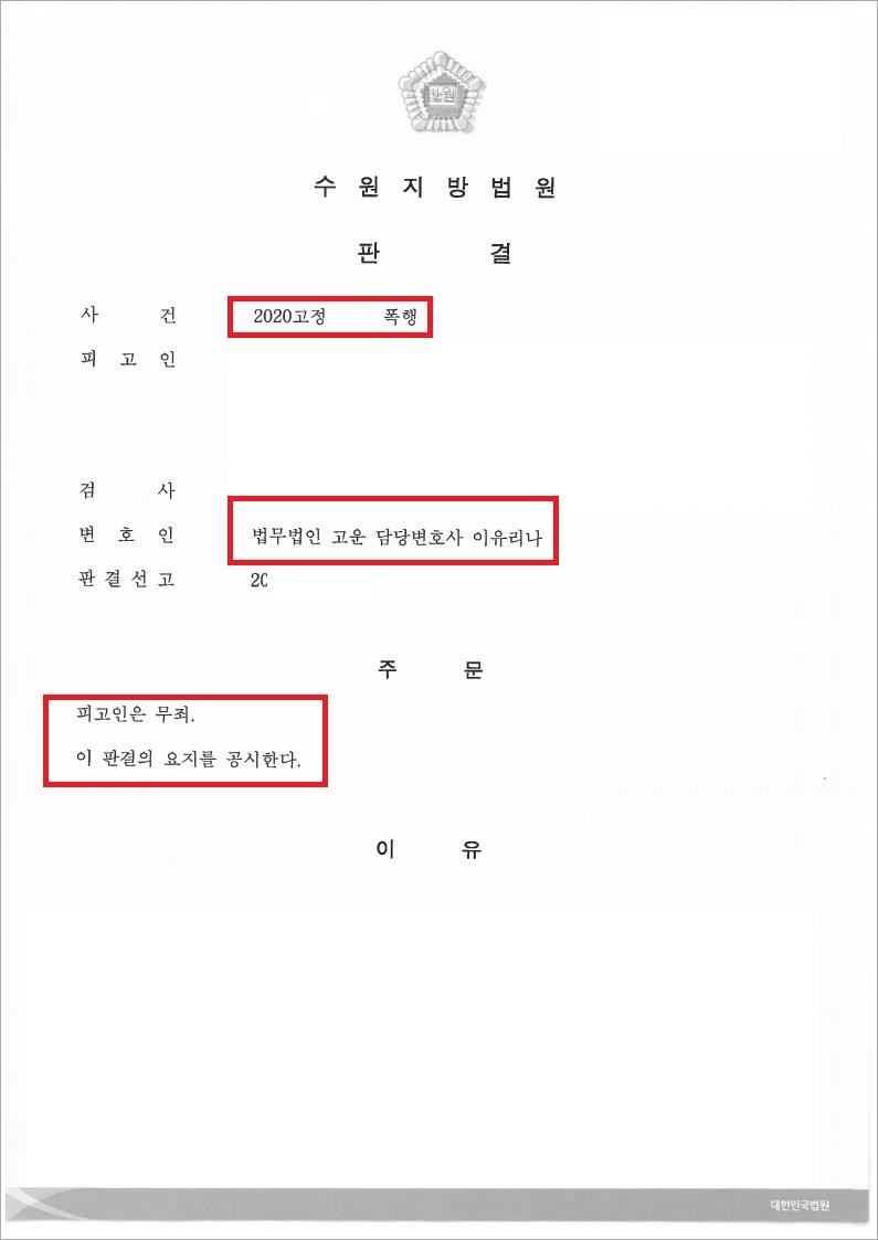 재판부는 법무법인 고운의 주장을 적극 받아들여 피고인에게 폭행 혐의가 없다며 무죄 선고를 내렸습니다. A는 억울하게 처벌받을 뻔한 처지에서 벗어나 자신의 무고함을 증명했다는 것에 만족하였습니다.