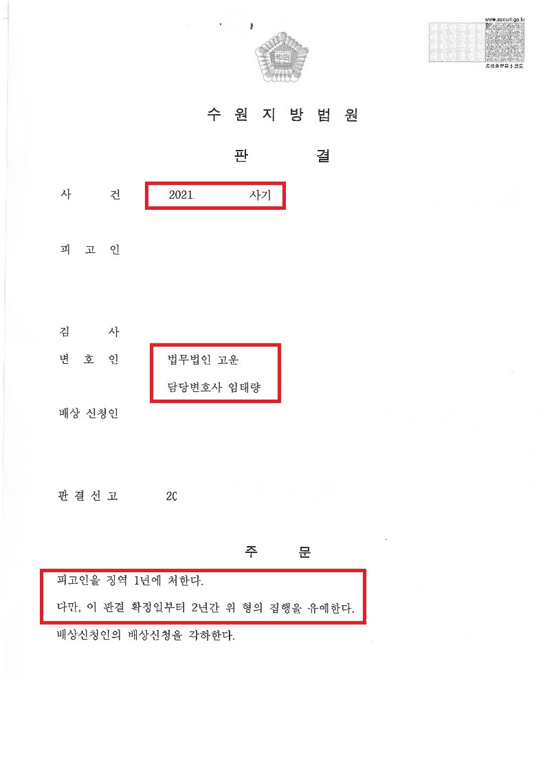 재판부는 법무법인 고운의 주장을 받아들였고 의뢰인에게 실형이 아닌 집행유예 판결을 내렸습니다. 의뢰인은 결과에 매우 만족하였습니다.