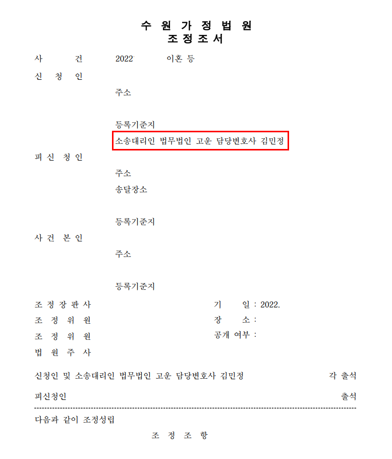 결국 의뢰인 A씨가 원하는 대로 원만히 조정이 성립되면서 신속하게 이혼절차를 마무리할 수 있게 되었습니다.